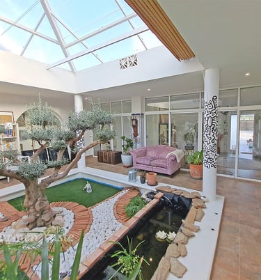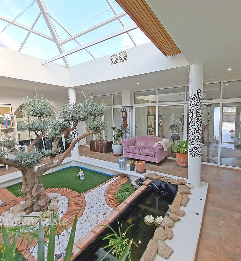 Se desarrolla en torno a un precioso patio central compuesto por un estanque donde un viejo olivo toma el máximo protagonismo. Perfectamente divididas quedan las estancias de descanso a un lado y las de ocio al otro.