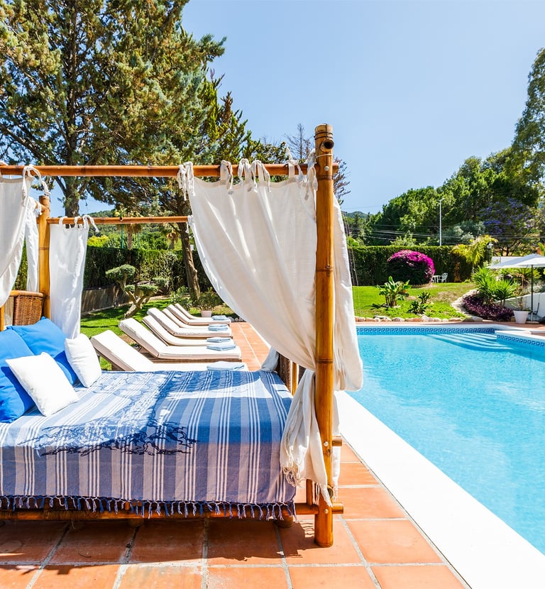 El exterior lo componen un maravilloso jardín maduro con diversidad de palmeras y especies tropicales, impresionante piscina de 15m x 8m rodeada de camas balinesas, barra de bar, zona de comedor y maravilloso Chillout, distribuidos en una parcela de 2.500m.